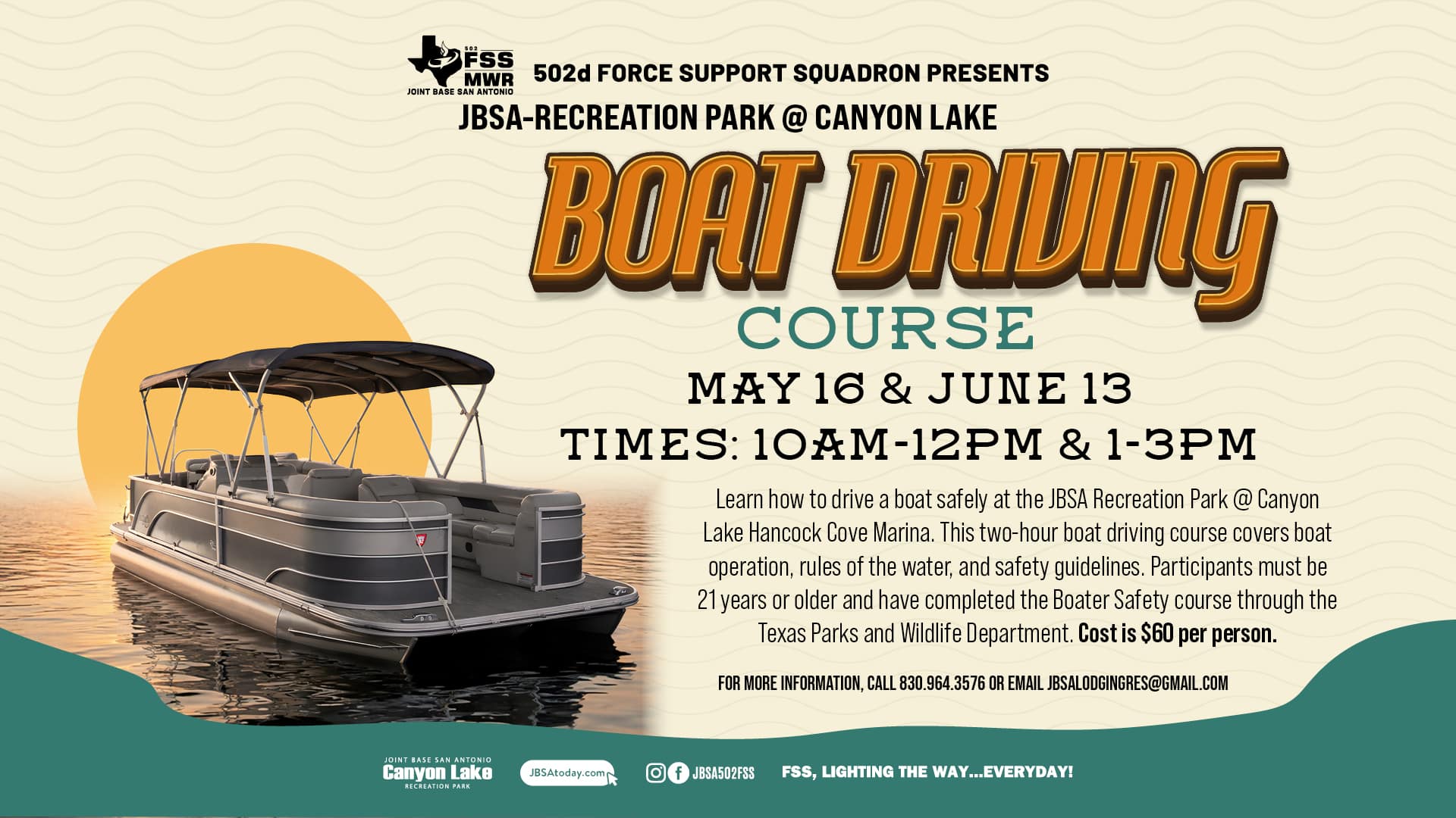 Learn how to drive a boat safely at the JBSA Recreation Park @ Canyon lake Hancock Cove marina. This tow-hour boat driving course covers boat operation, rules of the water, and safety guidelines. Participants must be 21 years or older and have completed the Boater Safety course through the Texas Parks and Wildlife Department. Cost is $60 per person.