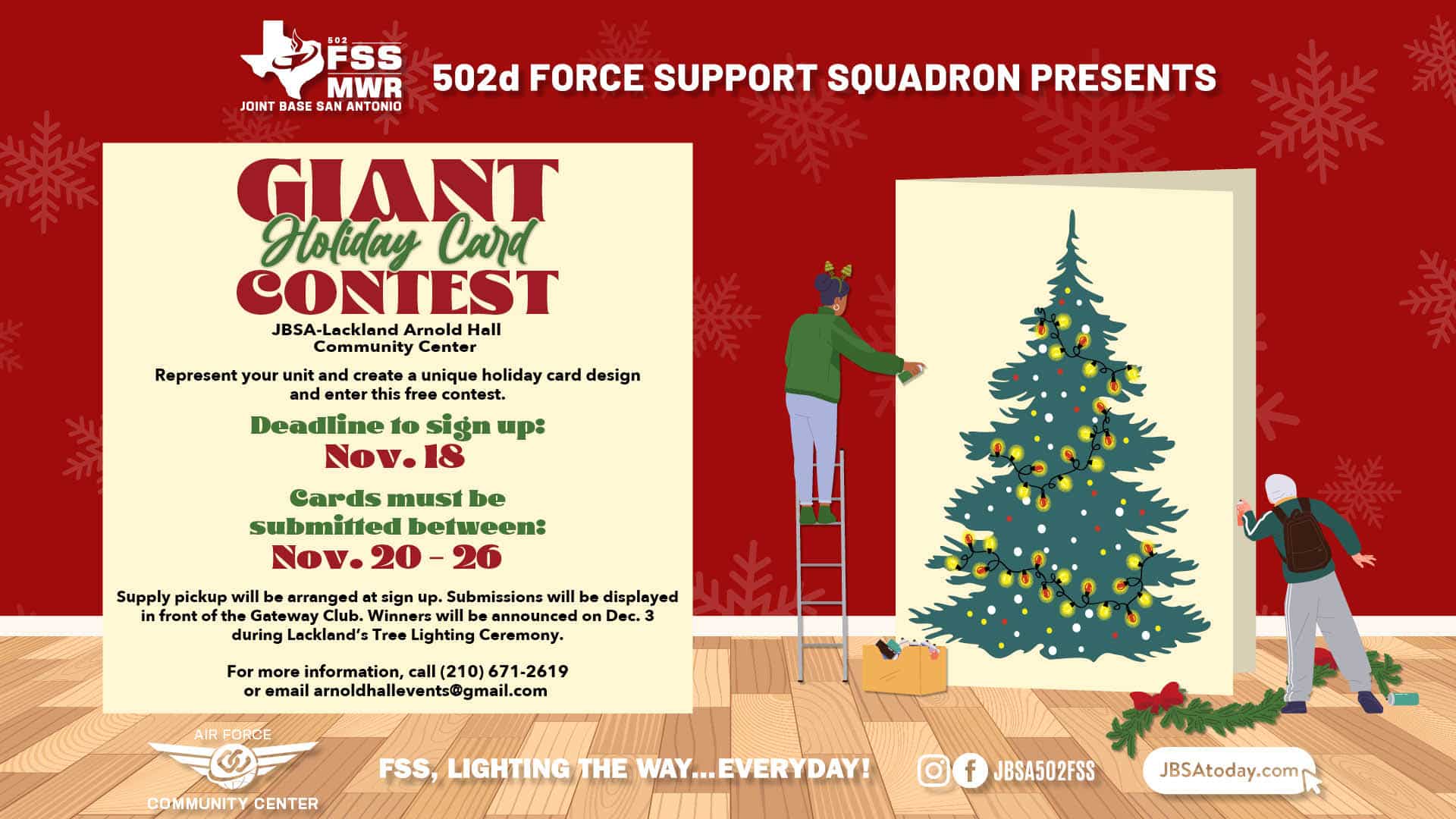 Represent your unit and create a unique holiday card design, and enter this free contest.ย Cards must be submitted between Nov. 20 – 26. The deadline to sign up is Nov. 18.ย ย Supply pickup will be arranged at sign up. Submissions will be displayed in front of the Gateway Club. Winners will be announced on Dec. 3 during Lackland’s Tree Lighting Ceremony.