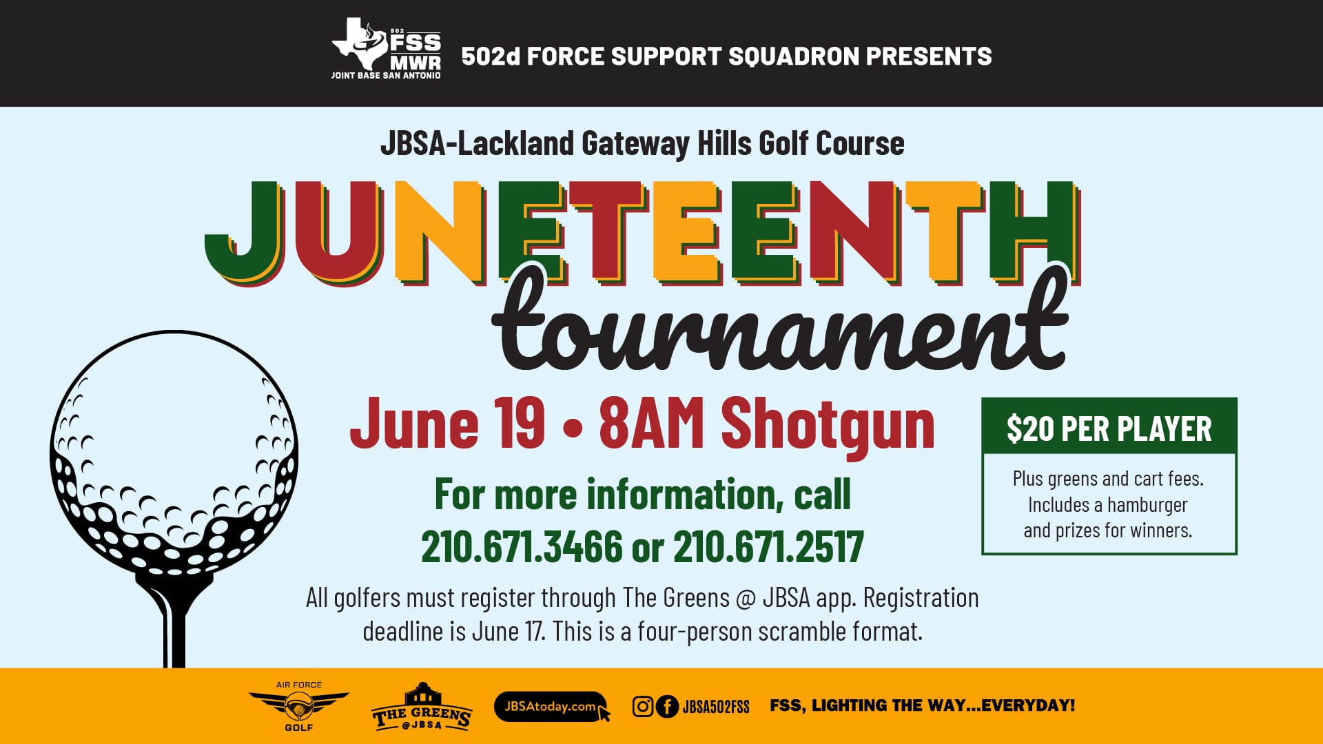 This is a four-person scramble format. Entry fee is $20 per player, plus greens and cart fees. Includes a hamburger and prizes for winners. Register through the Greens of JBSA app. Registration deadline is June 17.