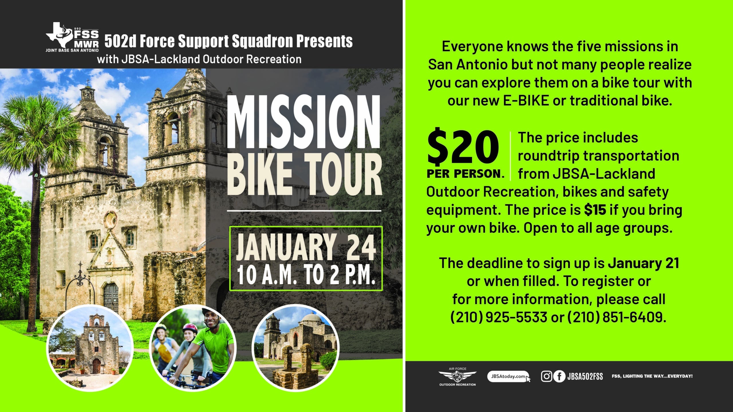 Everyone knows the five missions in San Antoni,o but not many people realize you can explore them on a bike tour with our new E-Bike or traditional Bike. For $20 per person, patrons receive round-trip transportation from Lackland Outdoor Recreation, bikes, and safety equipment. The price is only $15 if you bring your own bike. Open to all age groups.