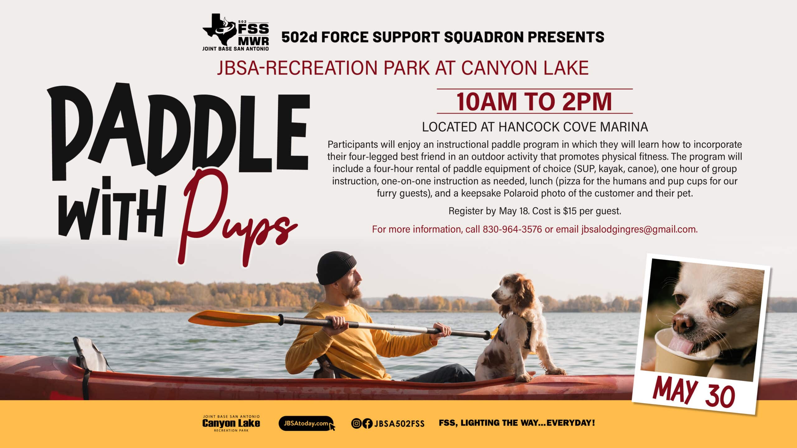 Located at Hancock Cove Marina. Participants will enjoy an instructional paddle program in which they will learn how to incorporate their four-legged best friend in an outdoor activity that promotes physical fitness. The program will include a four-hour rental of paddle equipment of choice (SUP, kayak, canoe), one hour of group instruction, one-on-one instruction as needed, lunch (pizza for the humans and pup cups for our furry guests), and a keepsake Polaroid photo of the customer and their pet. Register by May 18. Cost is $15 per guest.