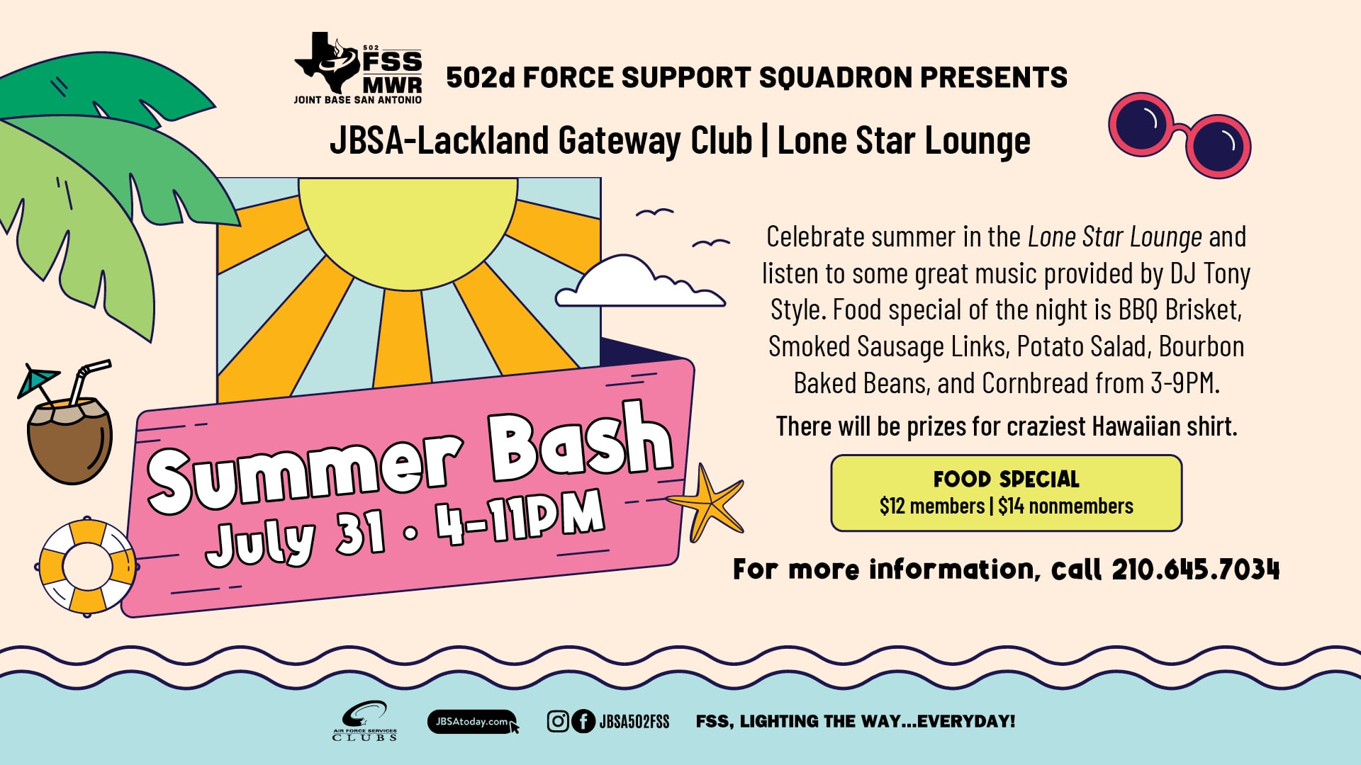 Celebrate summer in the Lone Star Lounge and listen to some great music provided by DJ Tony Style. The food special of the night is $12 for members and $14 for nonmembers. The special includes BBQ Brisket, Smoked Sausage Links, Potato Salad, Bourbon Baked Beans, and Cornbread from 3-9pm. There will be prizes for the craziest Hawaiian shirt.