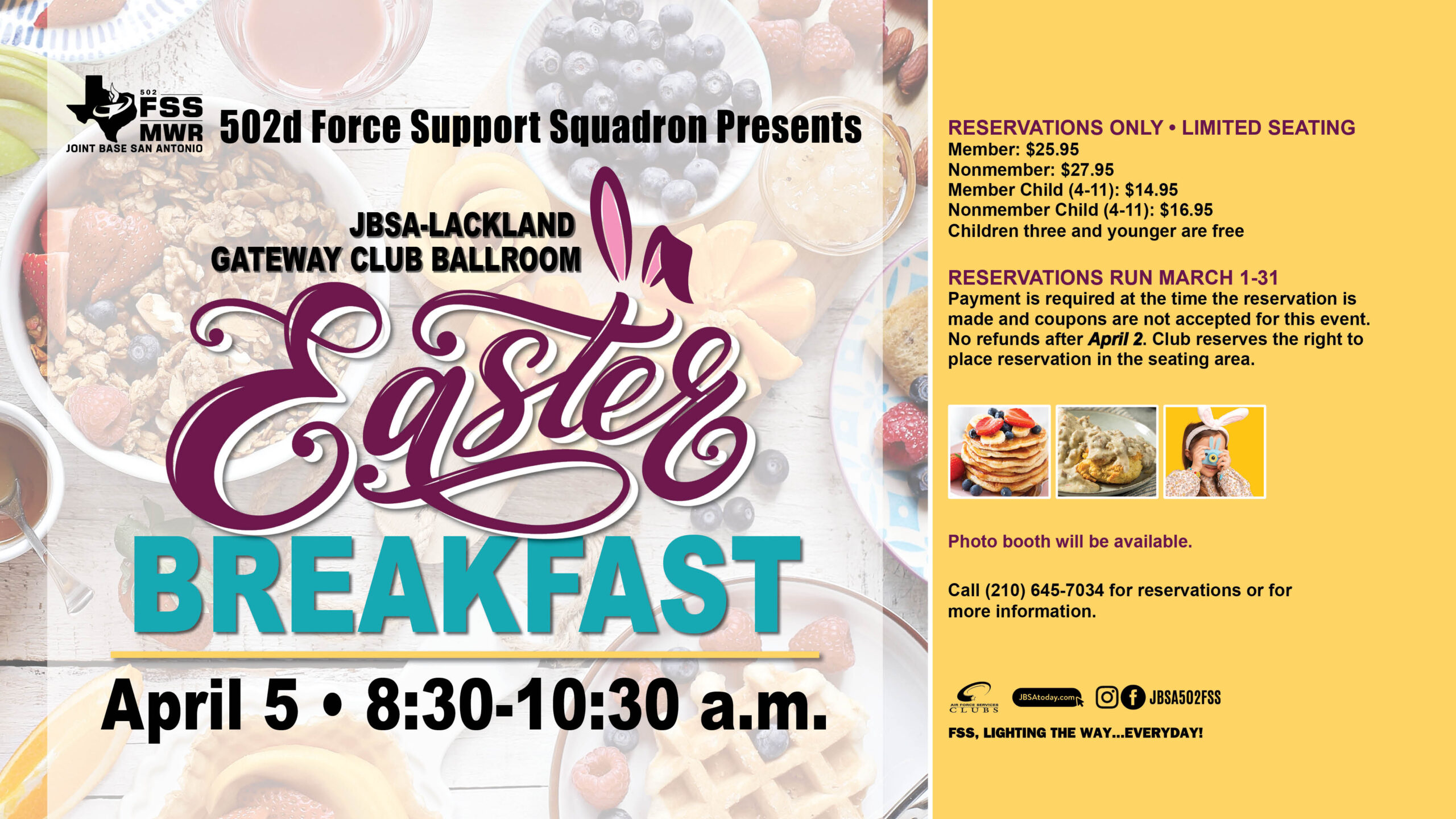 JBSA-Lackland Gateway Club April 5 | 8:30-10:30 a.m. RESERVATIONS ONLY • LIMITED SEATING Member: $25.95 Nonmember: $27.95 Member Child (4-11): $14.95 Nonmember Child (4-11): $16.95 Children three and younger are free RESERVATIONS RUN MARCH 1-31 Payment is required at the time the reservation is made, and coupons are not accepted for this event. No refunds […]