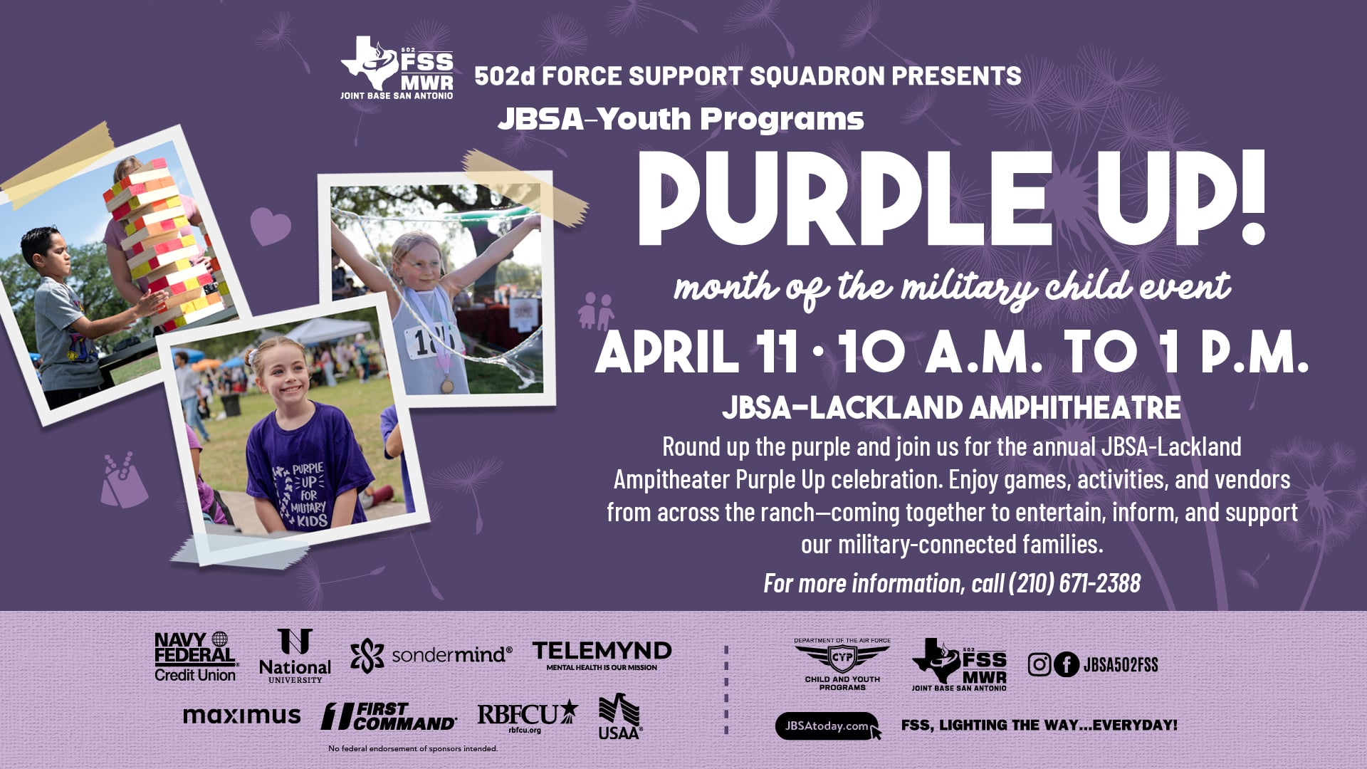 JBSA-Youth Programs April 11 | 10 a.m. to 1 p.m. Venue has been changed to Lackland Youth Programs due to weather Held at the JBSA-Lackland Amphitheater, round up the purple […]