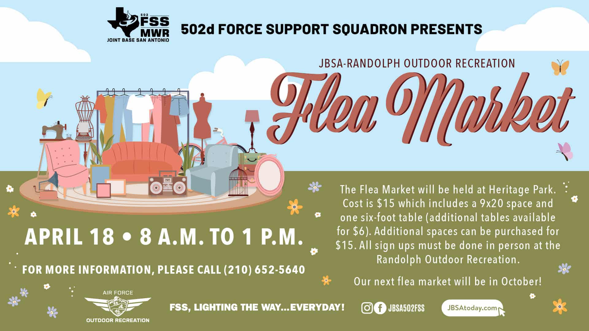 JBSA-RANDOLPH OUTDOOR REC April 18 | 8 a.m. to 1 p.m. The Flea Market will be held at Heritage Park. Cost is $15, which includes a 9x20 space and one […]