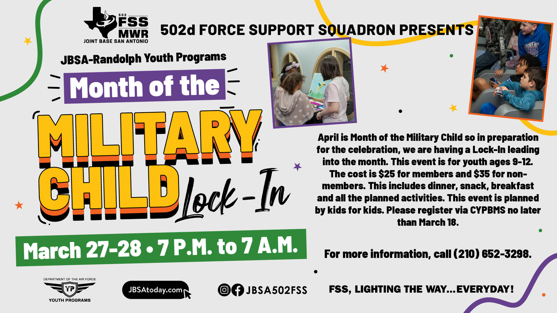 JBSA-Randolph Youth Programs March 27-28 | 7 p.m. to 7 a.m. April is Month of the Military Child so in preparation for the celebration, we are having a Lock-In leading […]