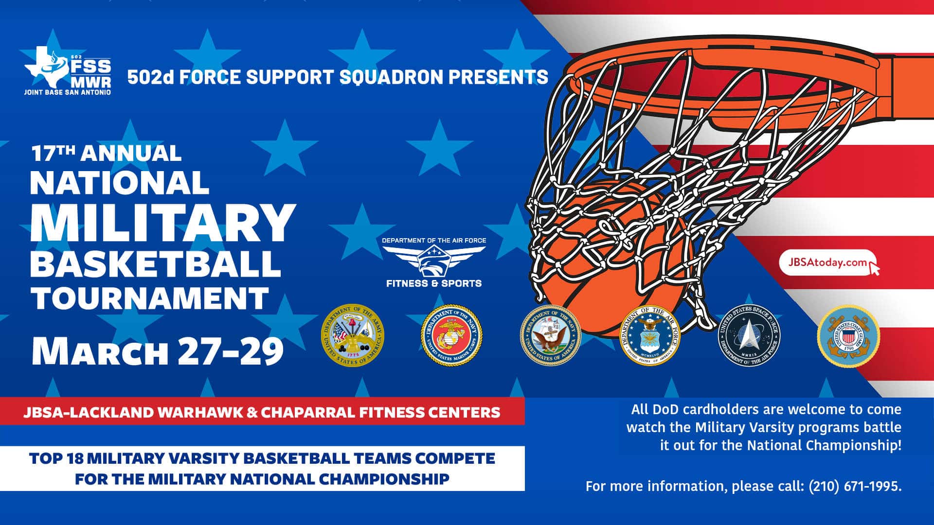JBSA-Lackland Warhawk & Chaparral Fitness Centers March 27-29 The top 18 military varsity basketball teams compete for the military national championship. All DoD ID cardholders are welcome to come watch the Military Varsity programs battle it out for the National Championship. For more information, call 210-671-1995.