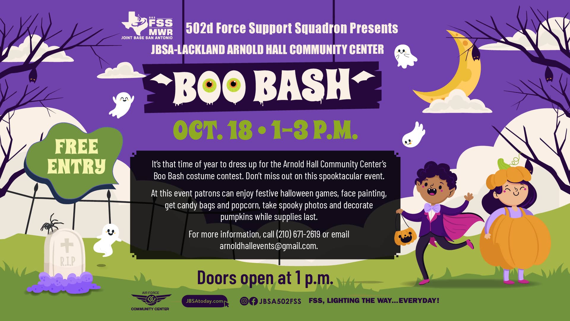 JBSA-Lackland Arnold Hall Community Center Oct. 18 | 1-3 p.m. It's that time of year to dress up for the Arnold Hall Community Center's Boo Bash costume contest. Don't miss […]