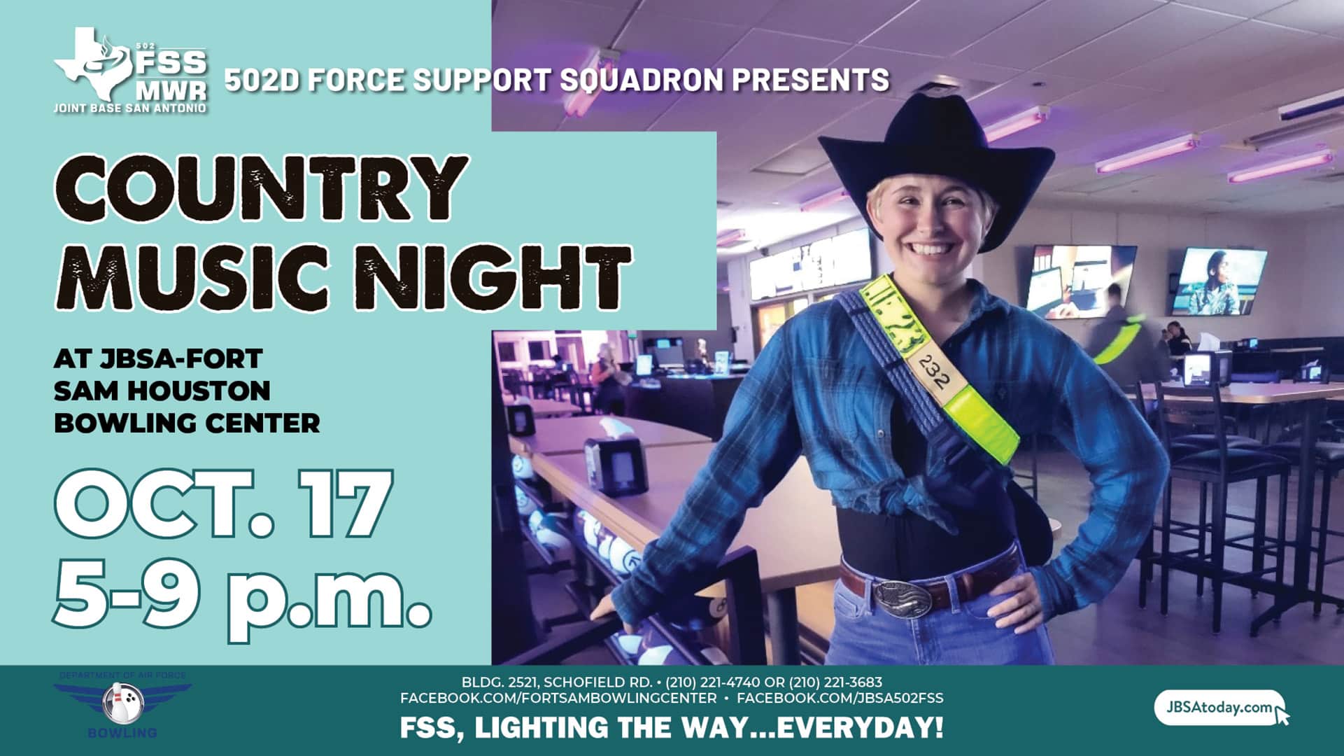 JBSA-Fort Sam HoustonBowling Center Oct. 17 | 5-9 p.m. Enjoy an evening of music and videos from your favorite country artist. Regular Bowling Prices Apply.  For more information, please call 210-221-4740