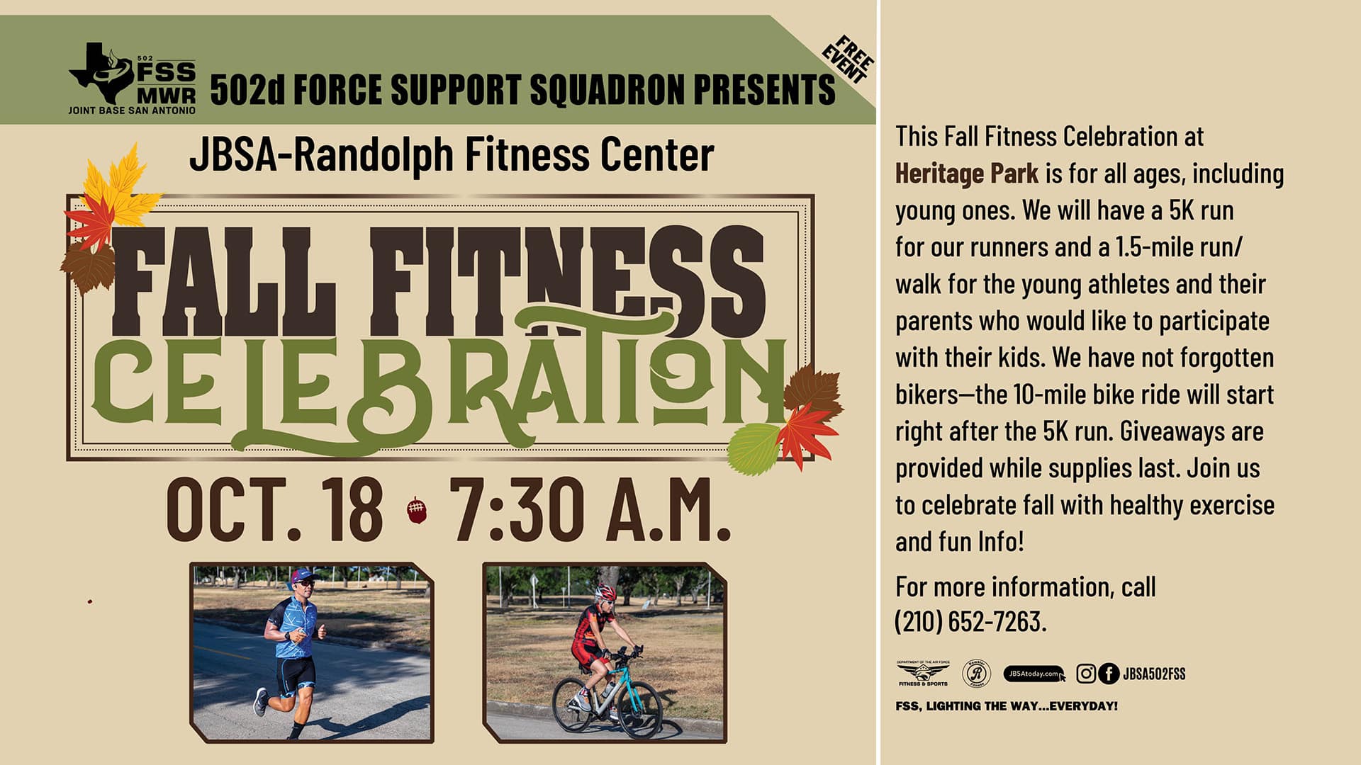 JBSA-Randolph Rambler Fitness Center Oct. 18 | 7:30 a.m. | Heritage Park This Fall Fitness Celebration at Heritage Park is for all ages, including young ones. We will have a […]