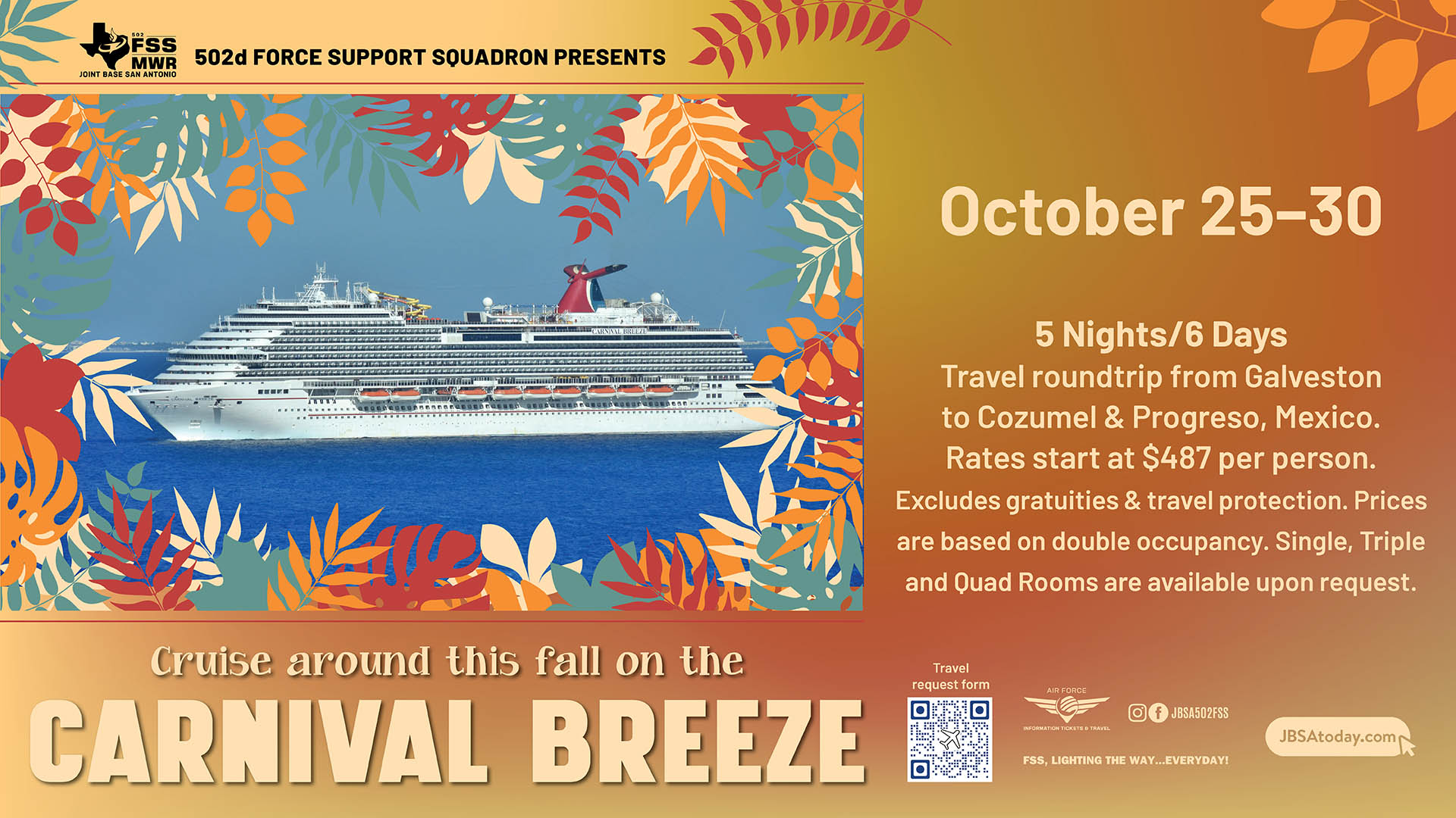 JBSA-Lackland Leisure Travel October 25-30 5 Night 6 Day Travel roundtrip from Galveston to Cozumel & Progreso, Mexico. Rates start at $487 per person. Excludes gratuities & travel protection. Prices […]