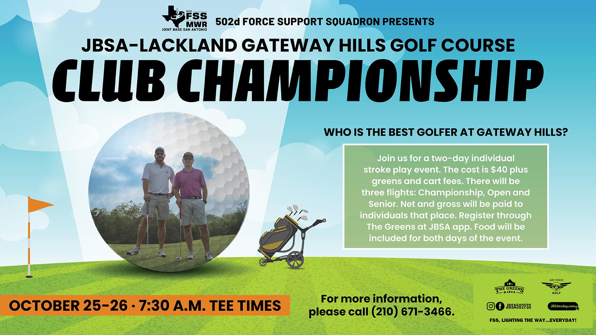 JBSA-Lackland Gateway Hills Golf Course Club Championship Oct. 25-26 | 7:30 a.m. Tee Times Who is the best golfer at Gateway Hills? Join us for a two-day individual stroke play event. The cost is $40 plus greens and cart fees. There will be three flights: Championship, Open and Senior. Net and gross will be paid […]