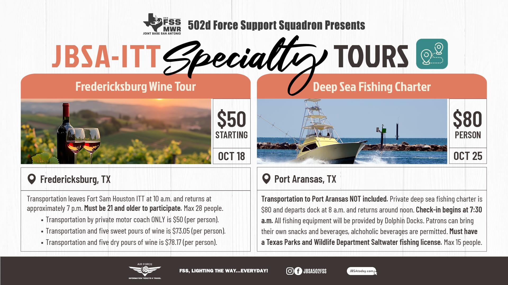 JBSA-Information, Tickets and Travel Specialty Tours Fredericksburg Wine Tour Oct. 18 | Starting at $50 Transportation leaves Fort Sam Houston ITT at 10 a.m. and returns at approximately 7 p.m. […]