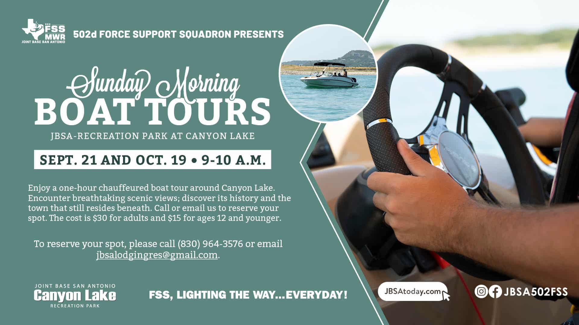 JBSA Recreation Park at Canyon Lake Oct. 19 | 9-10 a.m. Enjoy a one-hour chauffeured boat tour around Canyon Lake. Encounter breathtaking scenic views; discover its history and the town […]