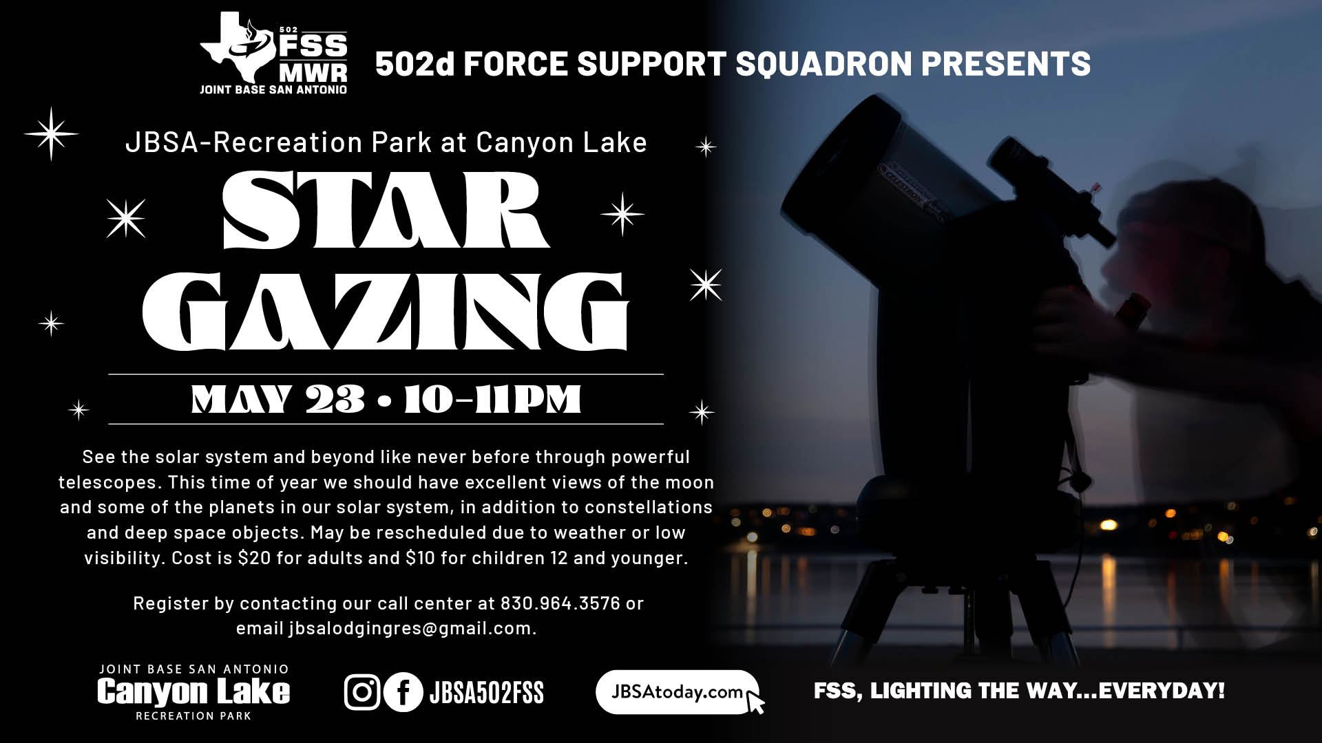 JBSA-Lackland Outdoor Recreation May 23-24 • 12pm-2pm For those who enjoy stargazing but find it difficult to see the night sky clearly in the city, this experience offers the perfect […]