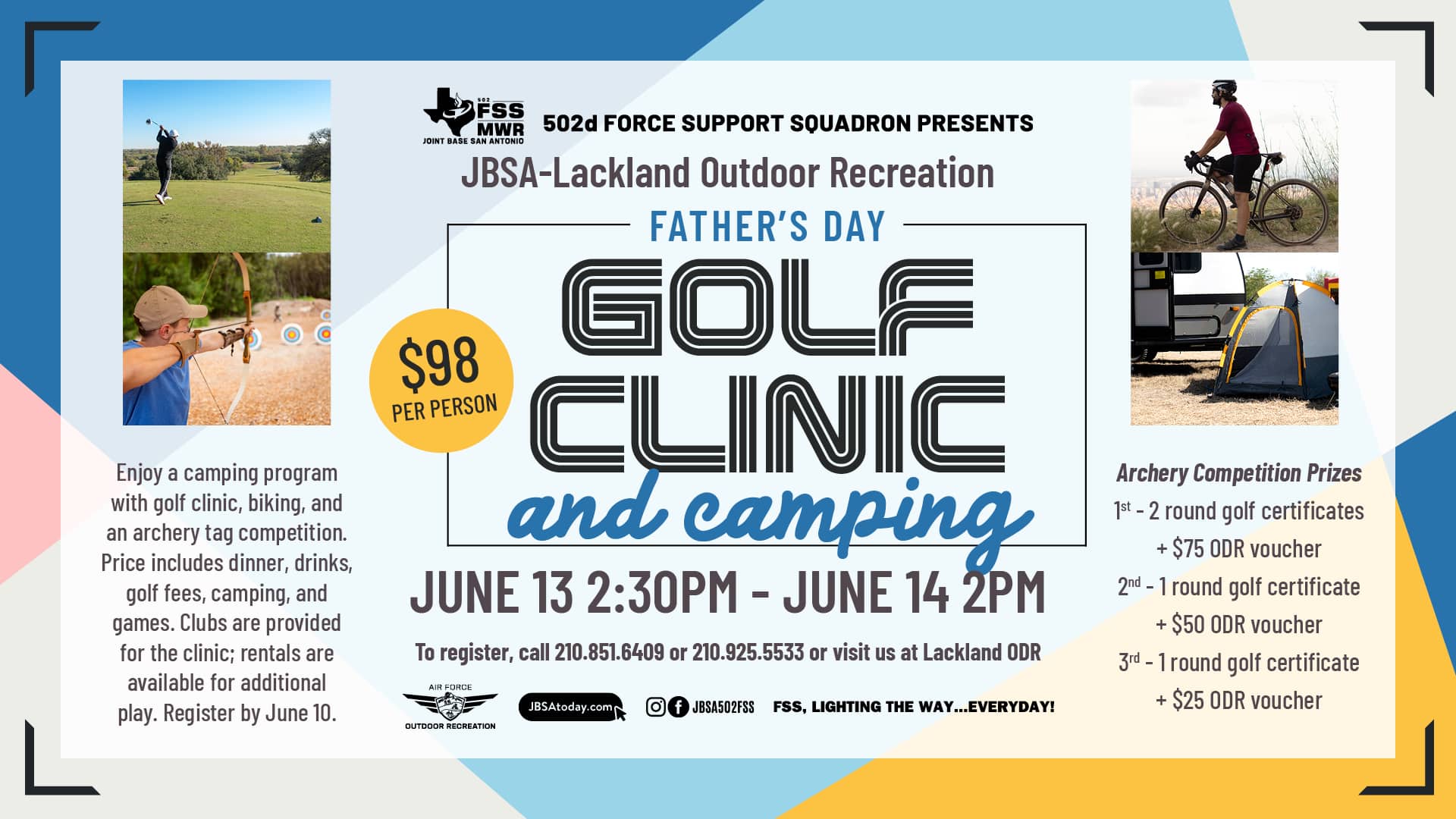 JBSA-Lackland Outdoor Rec June 13-14 | 2:30pm-2pm Enjoy a camping program with golf clinic, biking, and an archery tag competition. Price includes dinner, drinks, golf fees, camping, and games. Clubs are provided for the clinic; rentals are available for additional play. Register by June 10. Cost is $98 per person Archery Competition Prizes 1st - […]