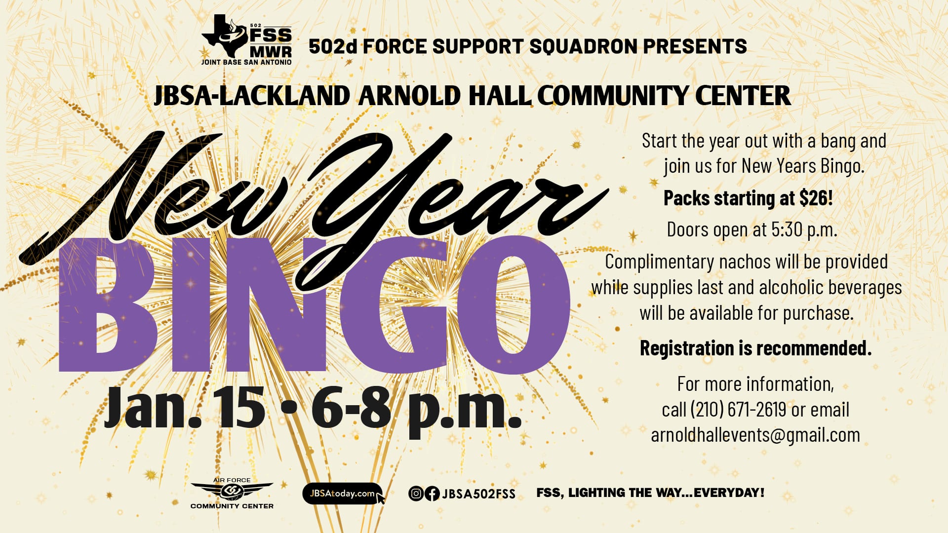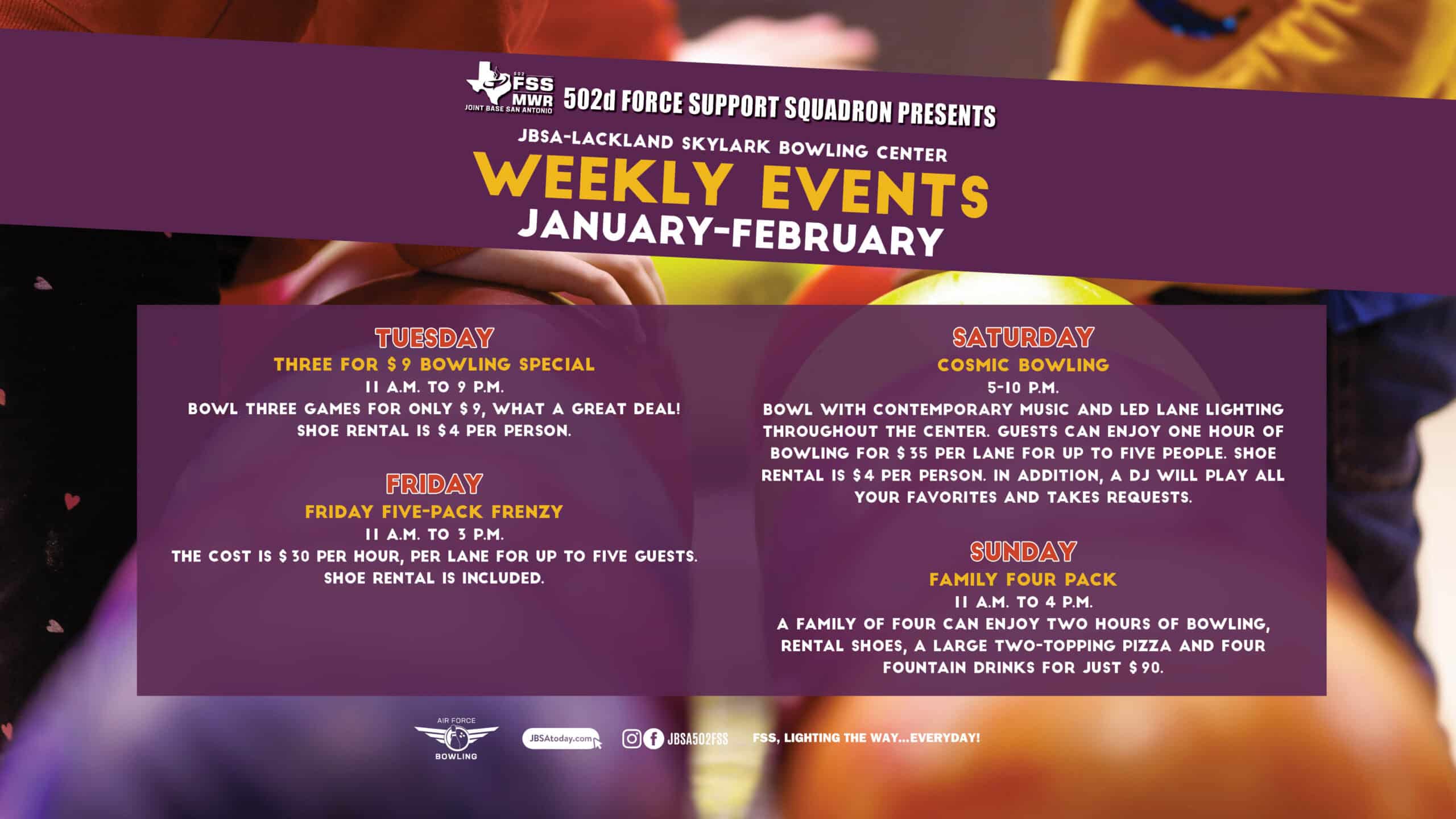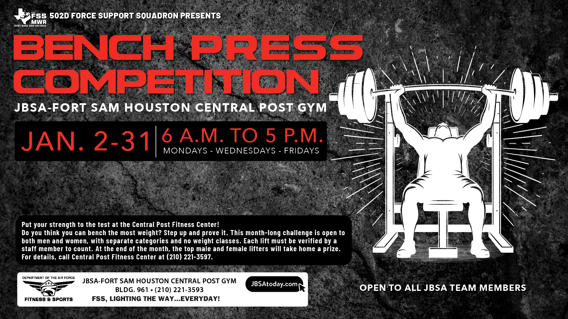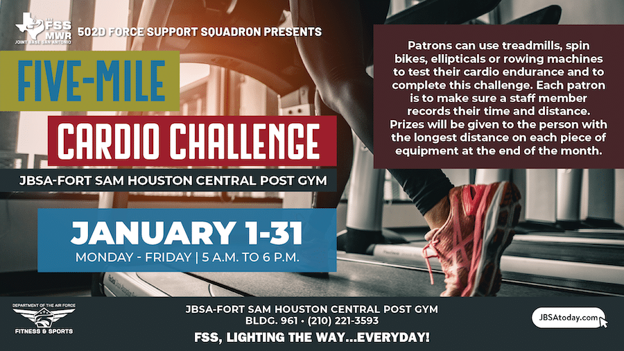 JBSA-Fort Sam Houston Central Post Gym Jan. 1-31 • Monday-Friday • 5 a.m. to 6 p.m. Patrons can use treadmills, spin bikes, elliptical or rowing machines to test their cardio endurance and to complete this challenge. Each patron is to make sure a staff member records their time and distance. Prizes will be given to […]