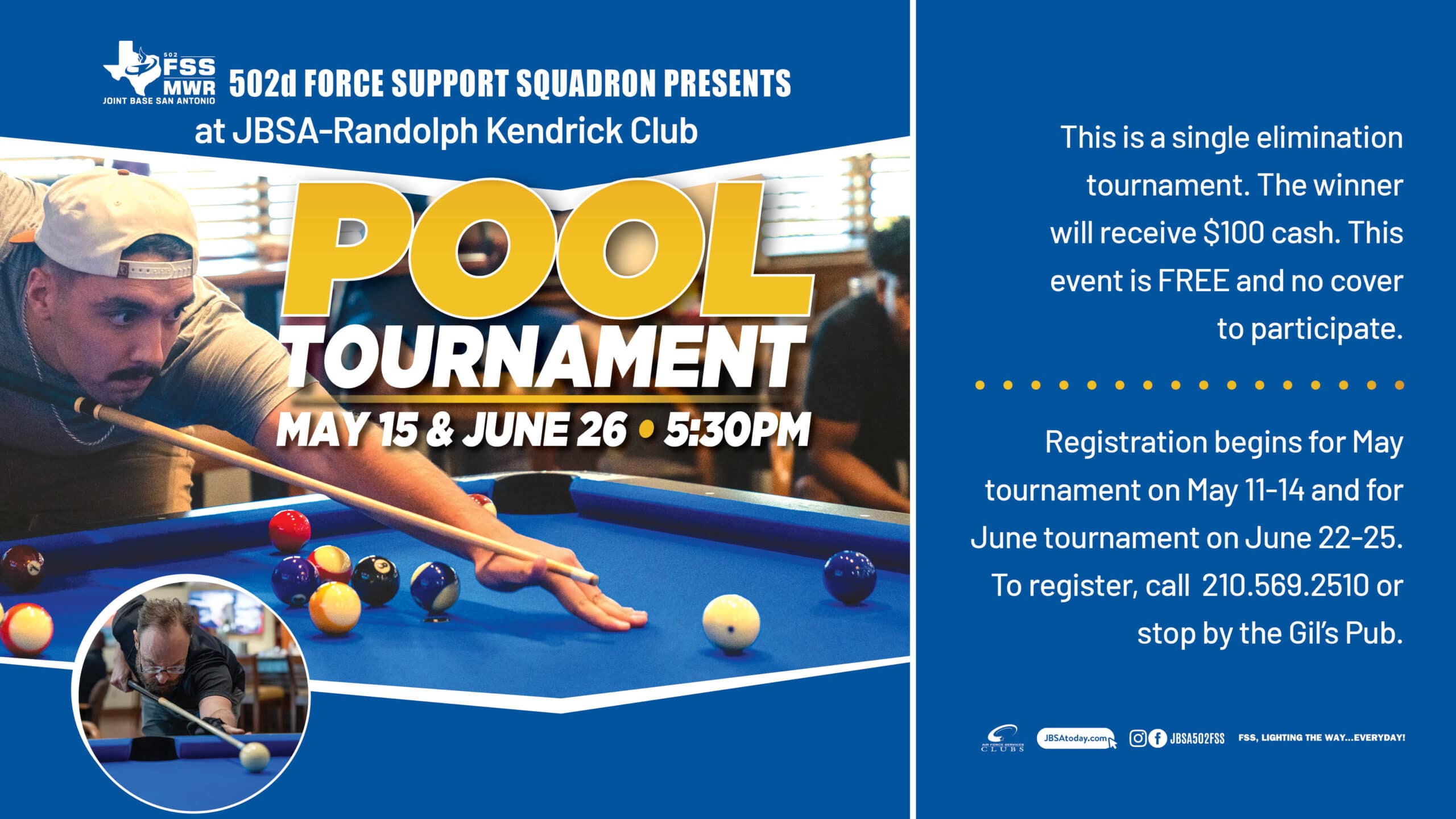 JBSA-Randolph Kendrick Club May 15 & June 26 | 5:30pm This is a single-elimination tournament. The winner will receive $100 cash. This event is free, and there is no cover […]