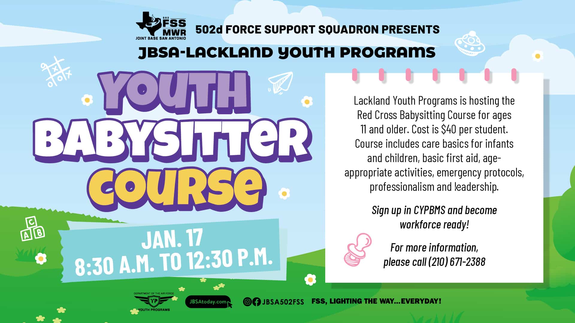 JBSA-Lackland Youth Programs Jan. 17 | 8:30 AM to 12:30 PM Lackland Youth Programs is hosting the Red Cross Babysitting Course for ages 11 and older. Cost is $40 per […]