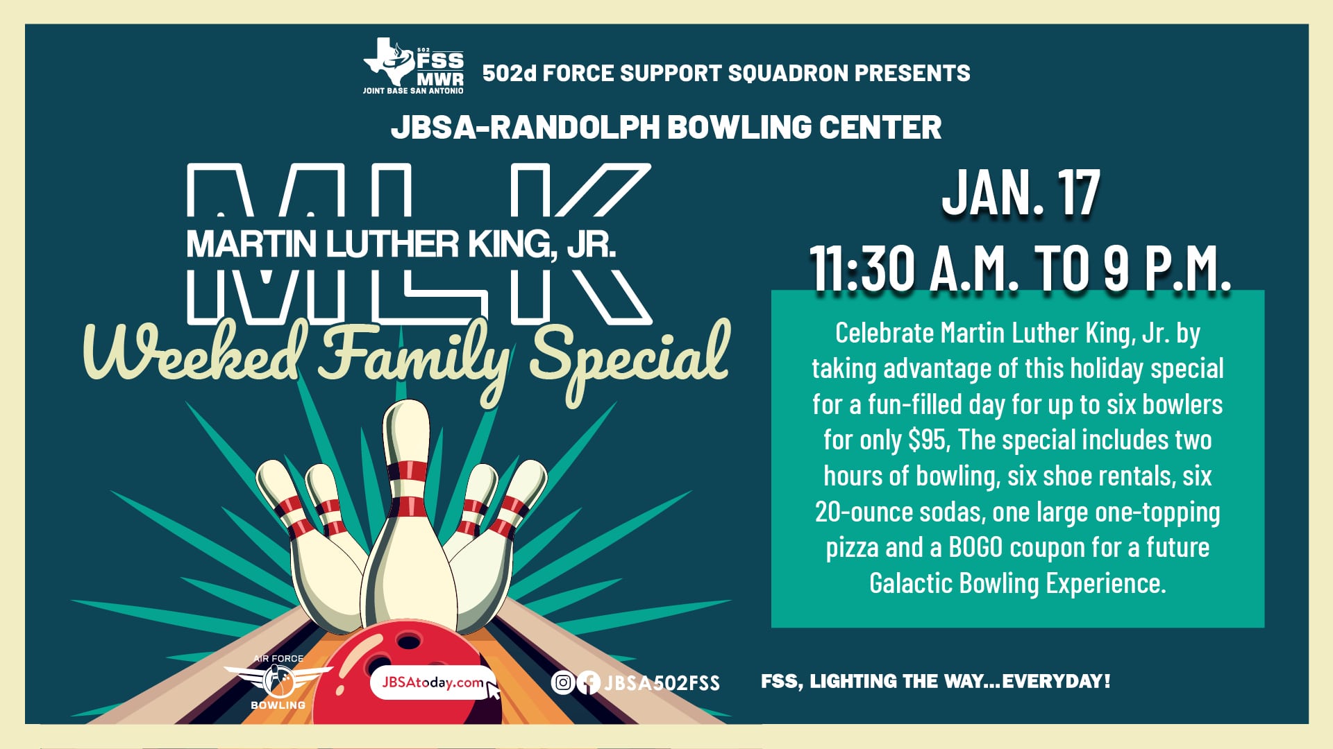 JBSA-Randolph Bowling Center Jan. 17 | 11:30 AM to 9 PM Celebrate Martin Luther King, Jr. by taking advantage of this holiday special for a fun-filled day for up to […]