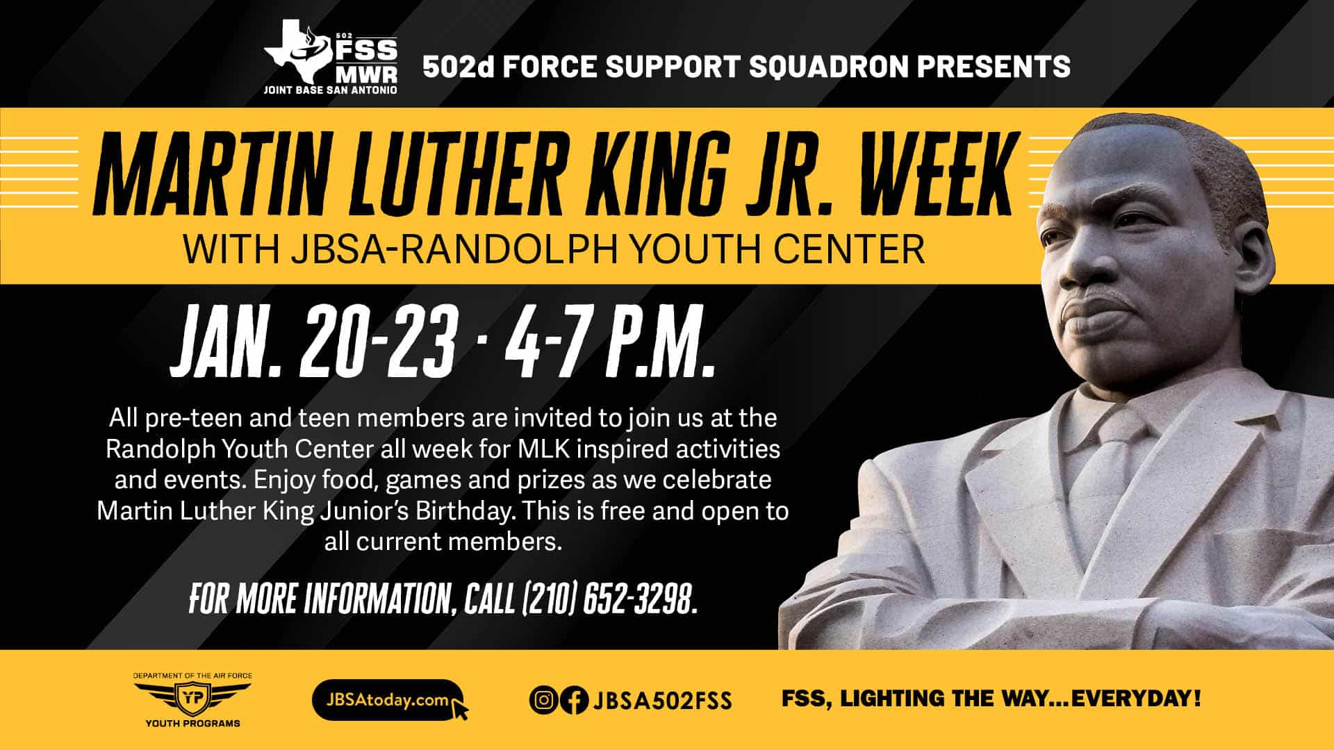 JBSA-Randolph Youth Programs Jan. 20-23 | 4-7 p.m. All pre-teen and teen members are invited to join us at the Randolph Youth Center all week for MLK inspired activities and […]
