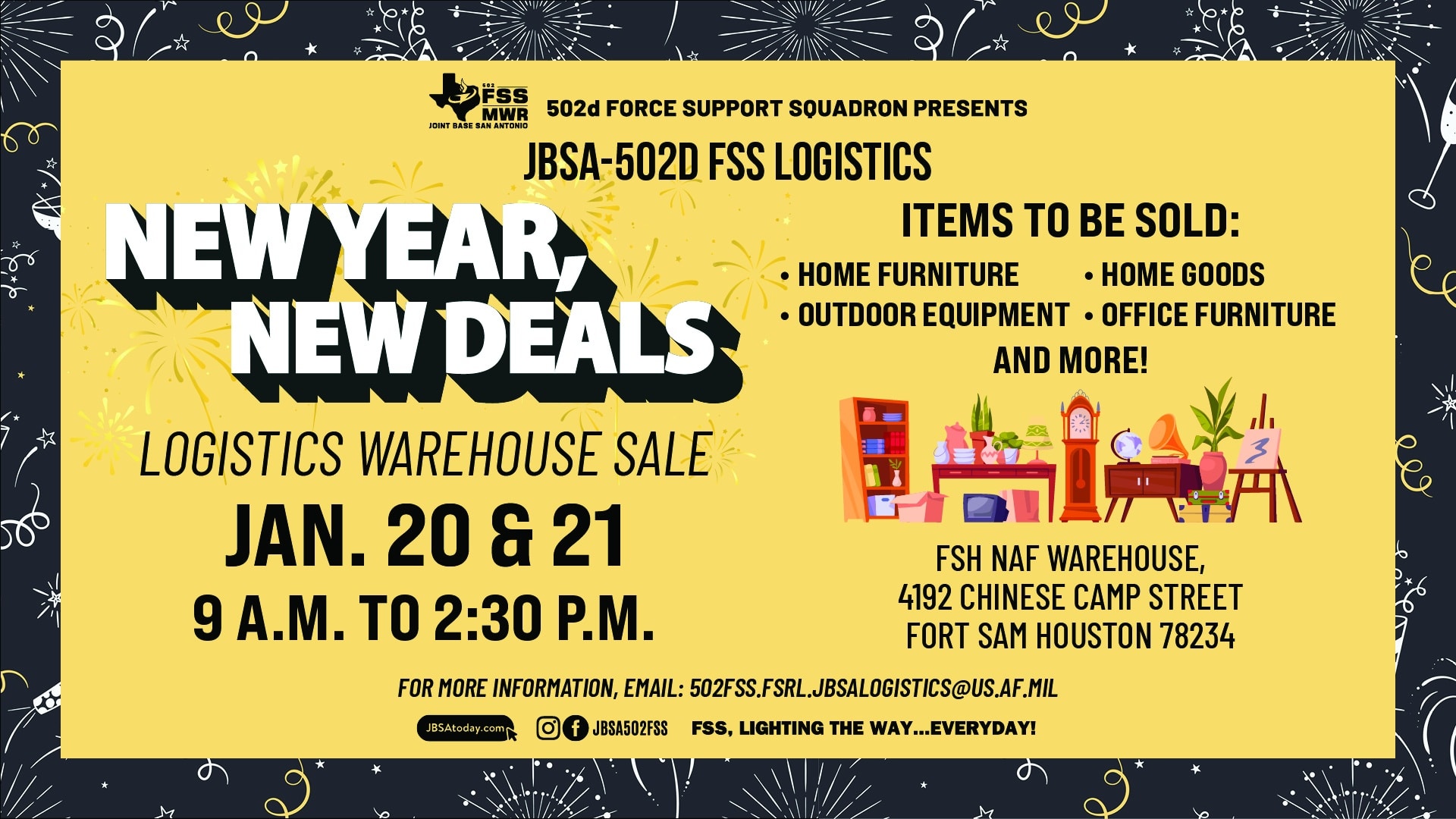 JBSA 502d FSS Logistics Jan. 20 & 21 | 9 a.m. to 2:30 p.m. Logistics warehouse sale. Items to be sold include home furniture, home goods, outdoor equipment, office furniture […]