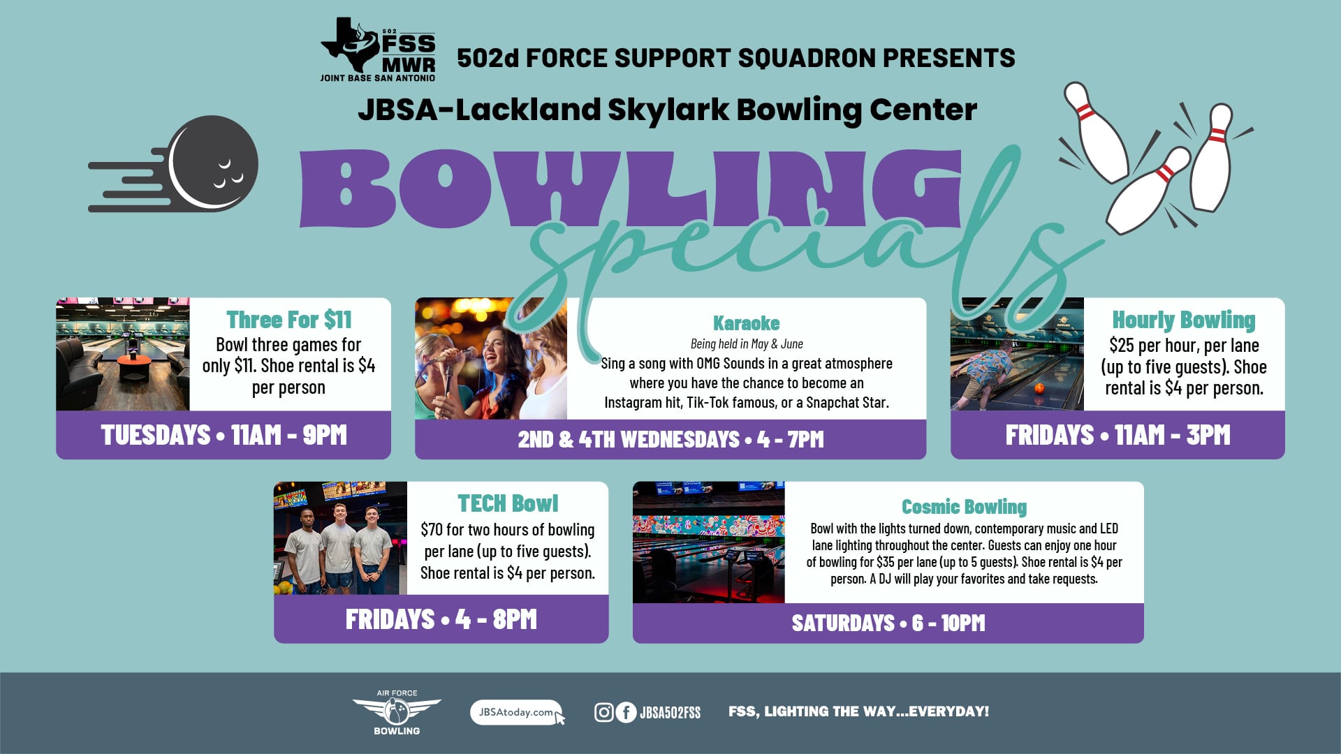 JBSA-Lackland Skylark Bowling Center Bowling Specials Three For $9 Bowling Special Every Tuesday | 11am-9pm Bowl three games for only $9, what a great deal! Shoe rental is $4 per […]