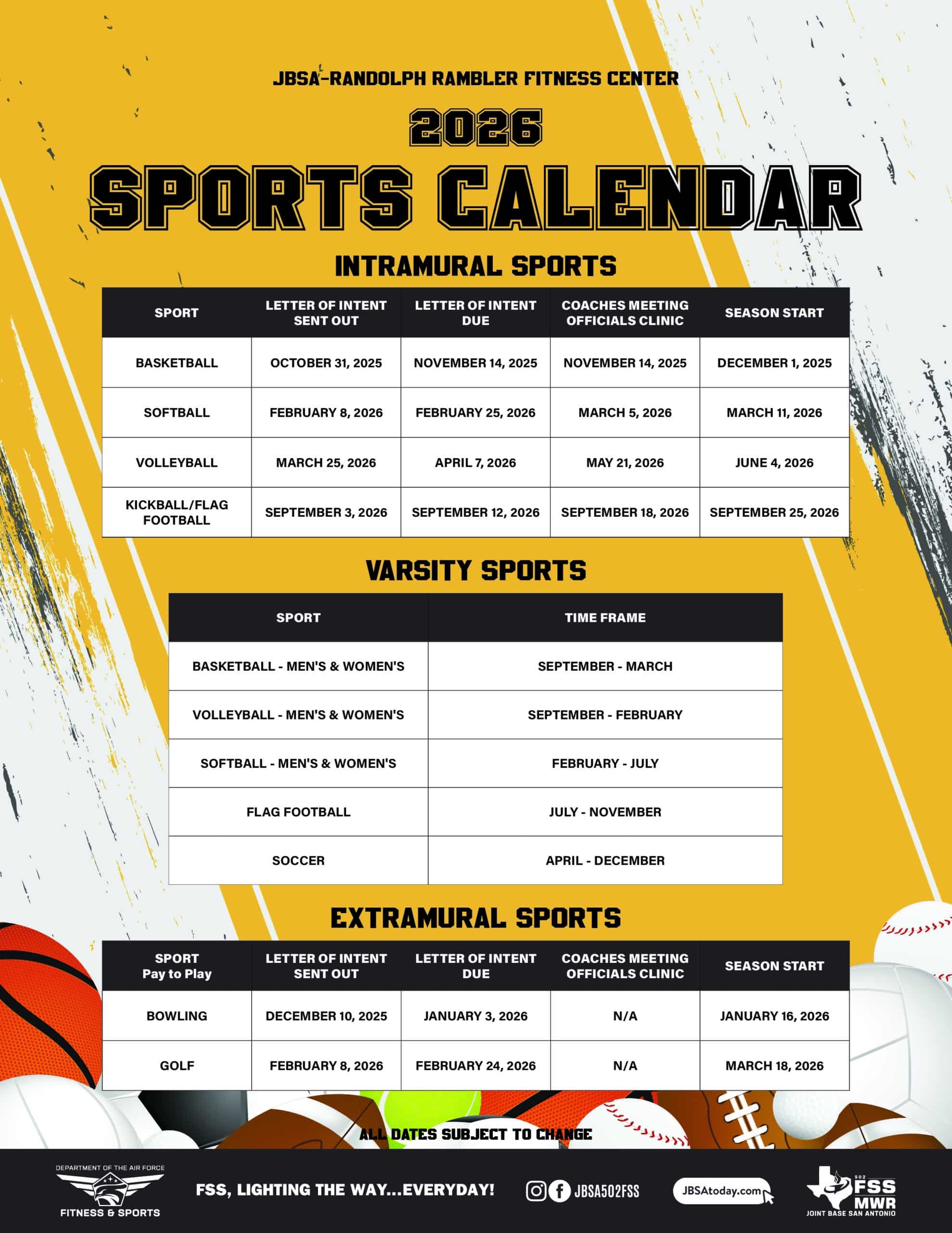 The JBSA Randolph Rambler Fitness Center offers Intramural and Varsity sports year-round. For more information stop by and speak with a fitness team member.