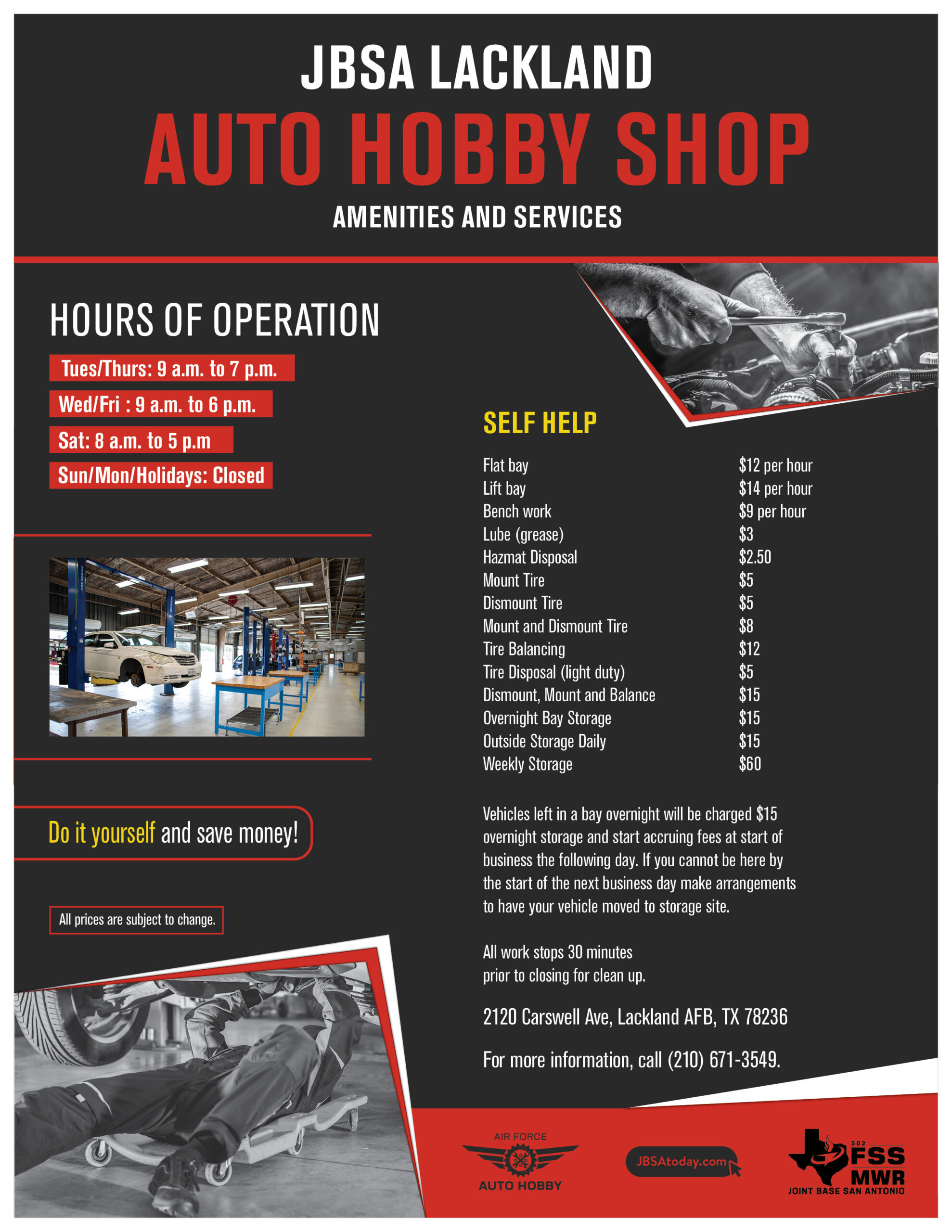The JBSA-Lackland Auto Hobby Shop offers everything needed for complete self-service repairs for your vehicles.