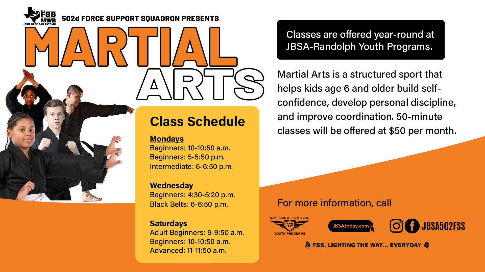 Classes are offered year-round. Martial Arts is a structured sport that helps kids age 6 and older build self-confidence, develop personal discipline, and improve coordination.